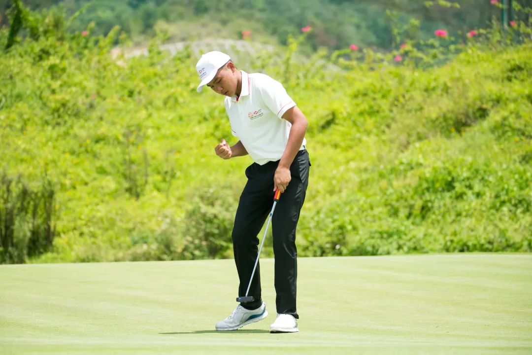 仝揚(yáng)在2019賽季以優(yōu)異表現(xiàn)一舉拿下匯豐青少年總決賽的冠軍,而今年他的目標(biāo)是再奪下兩個(gè)冠軍。今日賽場(chǎng)上的他不驕不躁,共計(jì)抓到5只小鳥,吞下3個(gè)柏忌,領(lǐng)先同組種子選手周子勤3桿。而全天最漂亮的一只小鳥來自二號(hào)洞,三桿洞。仝揚(yáng)在果嶺邊,距離旗桿25英尺,面對(duì)一個(gè)很大的斜坡,他的小球很激進(jìn),撞旗進(jìn)洞。他說在那里增強(qiáng)了自信,讓他可以放開手去爭(zhēng)取佳績(jī)。